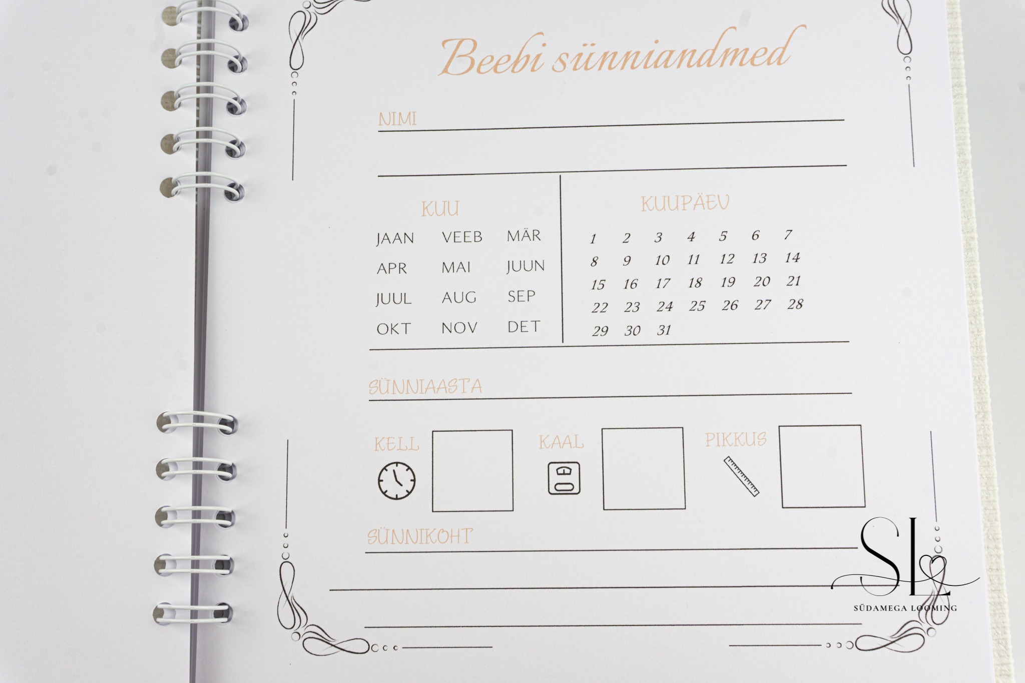 Albumis on 16 sisulehte, mis juhatavad sind läbi beebi 0–12 kuu. Seal on ruumi sünniandmetele, ootusele, esimesele naeratusele ja pisikestele sammudele. See sobib hästi kingituseks katsikuteks, sünnipäevaks või lihtsalt tänuks — alati, kui soovid kinkida midagi, mis jääb alles ja millel on tähendus. Tegemist on Eesti käsitööga, mis valmib iga tellija jaoks personaalselt ja hoolega.