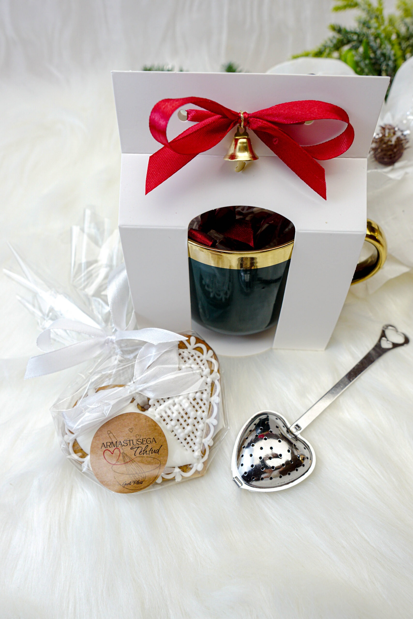 See väike jõulukinkekomplekt on loodud inimesele, kes hindab soojust, lihtsust ja hetki iseendaga. Komplekti keskmes on elegantne tass, mida saab soovi korral personaliseerida nime või lühikese tekstiga. Tassile lisandub südamekujuline teepuruhoidja ning kaunilt pakendatud käsitööpiparkook (meistrilt: Gerli Plees) – kõik kokku loob kingituse, mis on ühtaegu praktiline, armas ja hooliv. Komplekt sobib hästi nii kolleegile, õpetajale, sõbrale kui ka pereliikmele.
