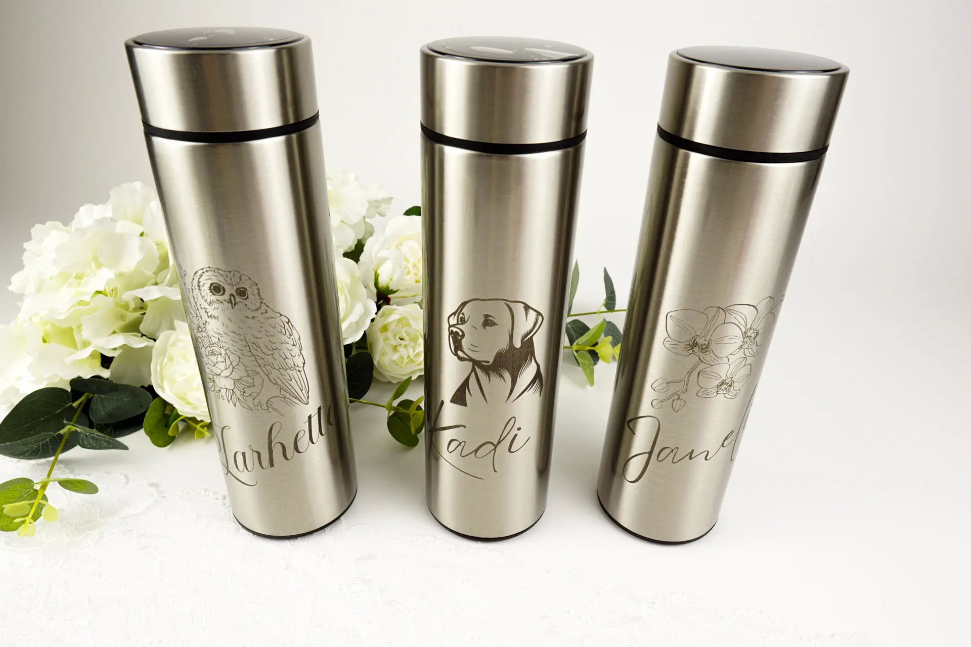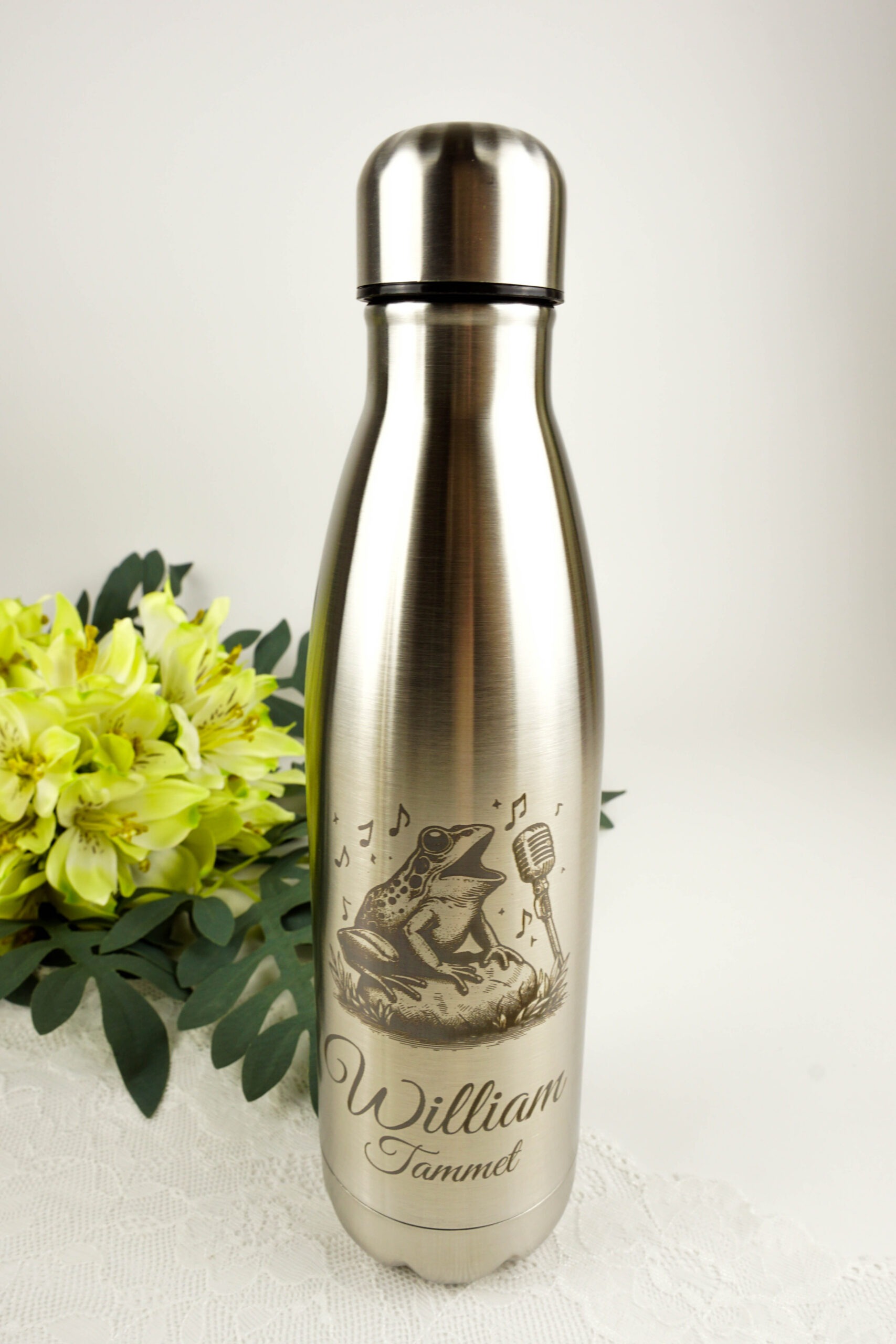 Valikus on nimeline graveering, looma- või taimemotiivid ja muud kujundused. Pudel sobib kingituseks nii täiskasvanutele kui lastele, kolleegile, õpetajale või sõbrale. Kui soovid, saab juurde pakkuda ka kinkepakendi.